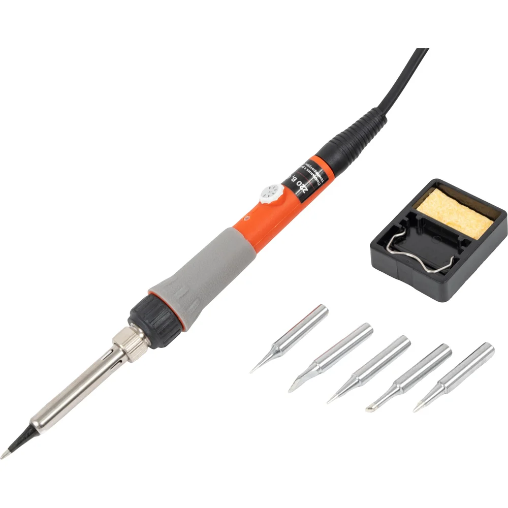 Керамический паяльник Gigant GES-03 мощностью 60 Вт — надежный и удобный паяльник с современной керамической нагревательной системой, предназначенный как для профессионалов, так и для домашних мастеров. Быстрый разогрев, широкие возможности регулировки температуры и расширенная комплектация делают его идеальным инструментом для точной электроники, ремонта техники, творчества и хобби. Особенности: Мощность: 60 Вт — быстрый выход на рабочую температуру для пайки большинства типов материалов. Керамический нагревательный элемент: обеспечивает стабильный нагрев и долгий срок службы без перегрева. Регулировка температуры (250–500°C): удобный плавный регулятор позволяет точно настроить температуру под каждую задачу. Пять сменных жал: подходят для различных работ — от пайки микросхем до монтажных работ. Эргономичная ручка: двухкомпонентное покрытие из нейлона и силикона надежно фиксируется в руке и не скользит. Компактная складная подставка: обеспечивает безопасность и удобство при перерывах в работе. Долговечное конусное жало: выполнено из меди и покрыто защитным лужением, устойчиво к износу и коррозии.