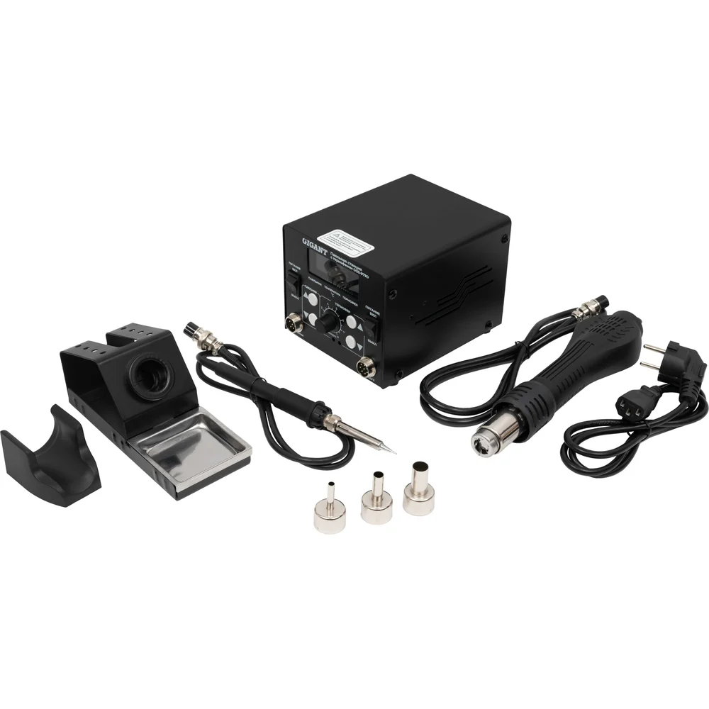 Паяльная станция Gigant с термофеном 650Вт GGS-979D предназначена профессиональных работ по демонтажу и пайки различных компонентов, включая SOIC, PLCC, QFP, BGA и т.д. Это надежный, удобный и производительный инструмент для профессионалов и любителей в области электроники. Высокая точность и стабильность температуры: Паяльная станция поддерживает точный контроль температуры с минимальной погрешностью. Диапазон температур для пайки: от 200 до 480 °C, а для фена от 100 до 500 °C. Функция памяти температурных настроек позволяет сохранять до 3 наборов настроек паяльника и фена, что упрощает работу с различными материалами. Специальный датчик точно поддерживает выбранную температуру. Надежность и долговечность: Использование качественных материалов, таких как медь, сталь, нержавеющая сталь, керамика и термостойкие пластики, обеспечивает долгий срок службы оборудования. Паяльные станции Gigant проходят специальное тестирование на старение, что гарантирует ее надежность в эксплуатации. Удобство и эргономика: Эргономичная конструкция ручки паяльника и фена обеспечивает комфортную работу. Наличие трех сменных насадок для фена с разными диаметрами (4.5 мм, 7.3 мм, 11.3 мм) позволяет адаптировать станцию под различные задачи. Функция сна для фена автоматически активируется при установке его на подставку, что повышает безопасность и экономит энергию. Простота управления: Интуитивно понятная панель управления с LCD-дисплеем, на котором отображаются текущие параметры (температура пайки, температура воздуха, скорость воздушного потока). Регулировка этих параметров осуществляется с помощью специальных кнопок. Компактность и мобильность: Небольшие габариты паяльной станции (173x131x116 мм) и легкий вес (1.91 кг) позволяют легко её переносить и хранить. Длина кабелей (паяльник - 1.1 м, фен - 1.3 м) обеспечивает удобство работы на рабочем месте. Продув воздухом после выключения прибора продлевает срок его службы. Дополнительные характеристики: 1 светодиодный дисплей Три сменных наконечника для термофена в комплекте Степень защиты: IP20 Рабочий ток: 0.026 А (без нагрузки), 2.5 А (под нагрузкой) Напряжение питания: 220-240V AC.