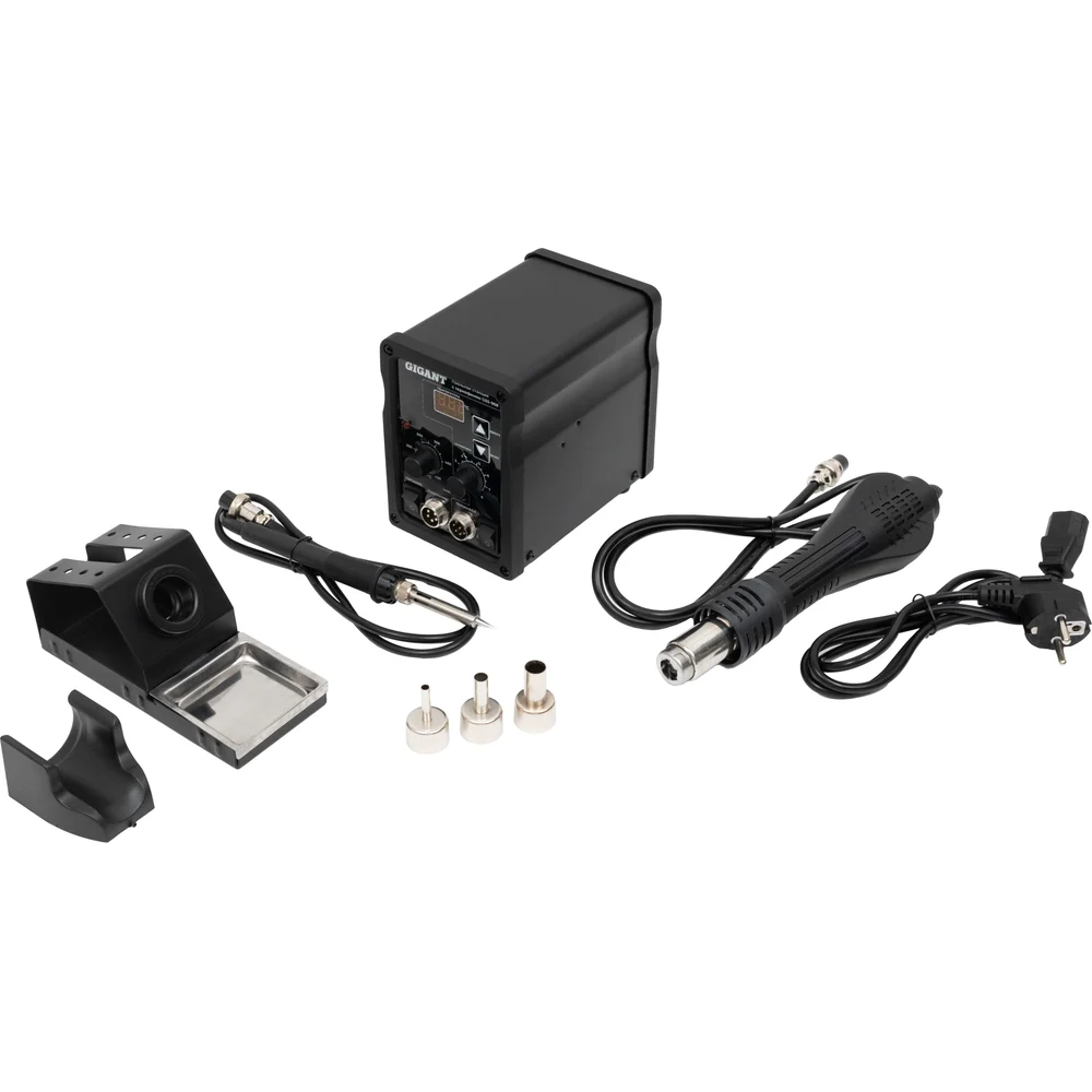 Паяльная станция Gigant с термофеном 600Вт GSS-968 служит для удобного и безопасного проведения процесса пайки или демонтажа различных видов компонентов (в том числе чувствительных, в корпусах: SOIC, PLCC, QFP, BGA и т. д.). Это надежный, удобный и производительный инструмент для профессионалов и любителей в области электроники. Высокая точность и стабильность температуры: Паяльная станция поддерживает точный контроль температуры с минимальной погрешностью. Диапазон температур для пайки: от 200 до 450 °C, а для фена от 100 до 500 °C. Функция памяти температурных настроек позволяет сохранять до 3 наборов настроек паяльника и фена, что упрощает работу с различными материалами. Специальный датчик точно поддерживает выбранную температуру. Надежность и долговечность: Использование качественных материалов, таких как медь, сталь, нержавеющая сталь, керамика и термостойкие пластики, обеспечивает долгий срок службы оборудования. Паяльные станции Gigant проходят специальное тестирование на старение, что гарантирует ее надежность в эксплуатации. Удобство и эргономика: Эргономичная конструкция ручки паяльника и фена обеспечивает комфортную работу. Наличие трех сменных насадок для фена с разными диаметрами (4.4 мм, 7.3 мм, 11.3 мм) позволяет адаптировать станцию под различные задачи. Функция сна для фена автоматически активируется при установке его на подставку, что повышает безопасность и экономит энергию. Простота управления: Интуитивно понятная панель управления с LCD-дисплеем, на котором отображаются текущие параметры (температура пайки, скорость воздушного потока). Регулировка этих параметров осуществляется с помощью кнопок аналоговых регуляторов. Компактность и мобильность: Небольшие габариты паяльной станции (165x100x142 мм) и легкий вес (2.46 кг) позволяют легко переносить и хранить станцию. Длина кабелей (паяльник - 1.1 м, фен - 1.3 м) обеспечивает удобство работы. Продув воздухом после выключения прибора продлевает срок его службы. Дополнительные характеристики: Три сменных наконечника для термофена в комплекте Степень защиты: IP20 Рабочий ток: 0.032 А (без нагрузки), 2.17 А (под нагрузкой) Наличие индикатора нагрева позволяет легко отслеживать состояние станции. Высококачественный керамический нагревательный элемент для быстрого достижения необходимой температуры. Контроль температуры с точностью до 1 °C.