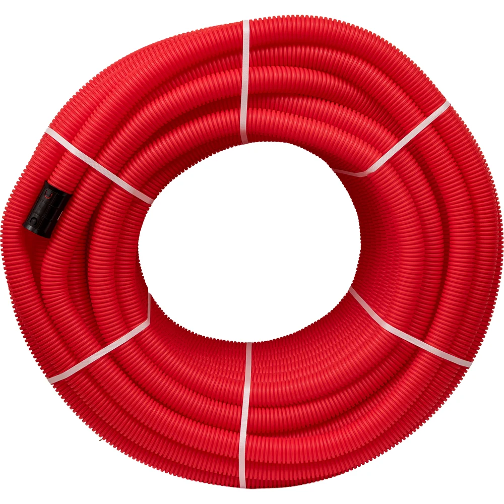 Гофрированная двустенная труба ПНД Gigant гибкая красная D50 100м 801050-100GI безгалогенная применяется для прокладки кабельных линий высокого и низкого напряжения скрытым способом (грунт, заливка в бетон), применяется в электроснабжении, телекоммуникации, транспортной инфраструктуре, ЖКХ. Обеспечивает защиту проводов и кабелей от механических повреждений и агрессивного воздействия окружающей среды. Степень защиты IP55 без использования уплотнительных колец, IP68 при использовании уплотнительных колец. Преимущества: Изготовлены из высококачественного ПНД, срок службы более 50 лет. Высокая герметичность соединения IP68 (при использовании уплотнительных колец). Кольцевая жесткость (сила сжатия по ГОСТ 61386.1-2014): SN26, более 450Н. Стабилизатор цвета обеспечивает защиту от выцветания при открытом хранении. Каждая бухта комплектуется соединительной муфтой и стальной протяжкой. Высокая коррозионная, химическая стойкость, а также герметичность соединения. Климатическое исполнение B5.