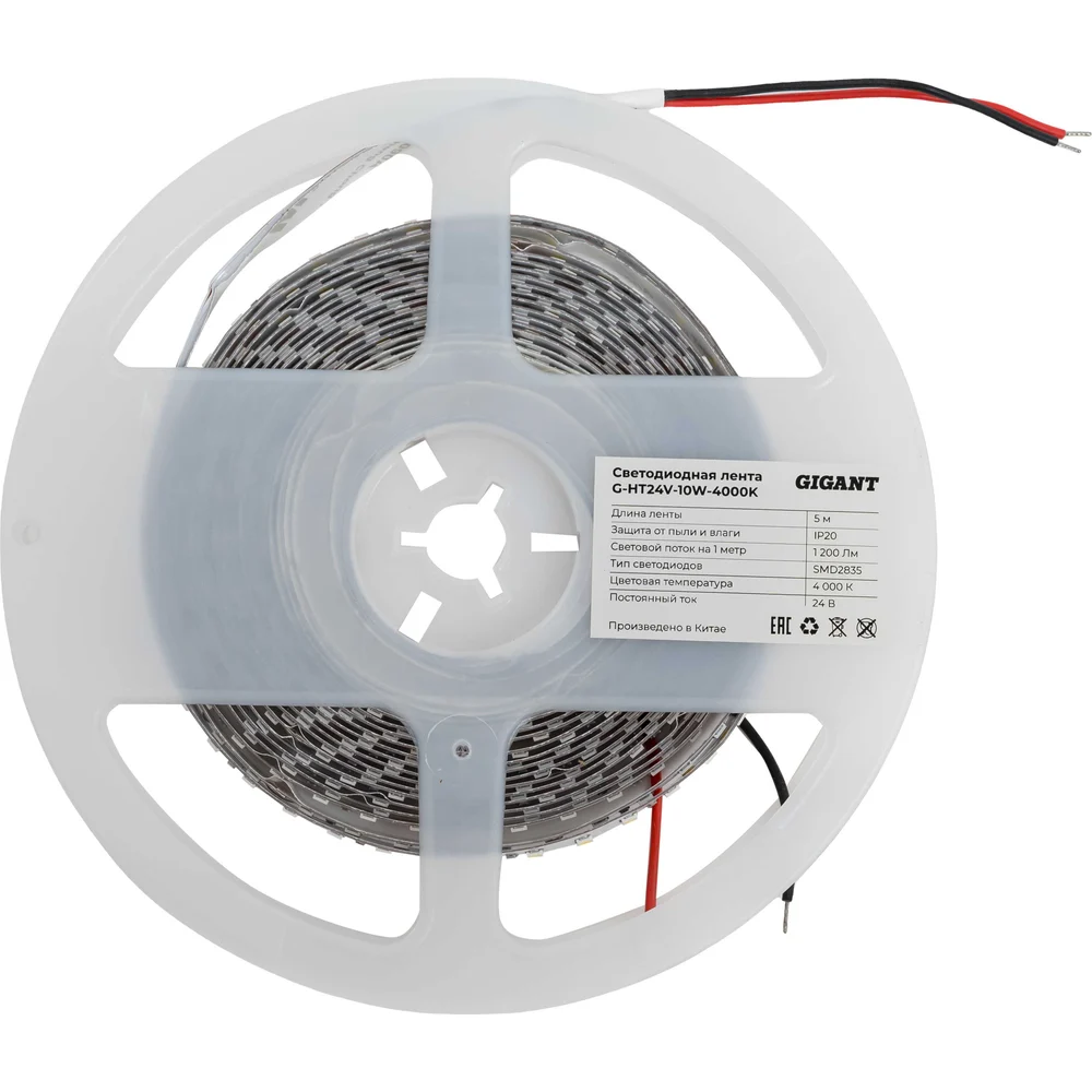 Светодиодная лента Gigant 5м, IP20, 1200Лм, 4000К G-HT24V-10W-4000K является отличным решением для изготовления светодиодных светильников в алюминиевом профиле. Благодаря высокой яркости с помощью таких светильников можно организовать основное освещение не только в жилых помещения, медицинских и образовательных учреждениях, но и торговых залах с большой высотой потолков. LED-подсветка обладает дневным белым цветом свечения с цветовой температурой 4000 К. При выборе светодиодной ленты важно учитывать такой параметр, как потребляемая мощность, чтобы правильно подобрать блок питания. Степень защиты этого изделия соответствует стандарту IP20, что подразумевает использование только в сухих и проветриваемых помещениях. Отрезать светодиодную ленту можно в специально отмеченных местах, которые располагаются через каждые 120 мм. Компактные размеры светодиодной ленты с шириной 8 мм и основанием из гибкой, двухслойной, медной подложки дают огромное преимущество при создании любых дизайнерских фантазий. Яркое и равномерное свечение без мерцания, цветовая температура 4000К комфортна для человеческого глаза. Срок службы светодиодов составляет до 40 000 часов. Удобный монтаж - задняя часть подложки имеет клейкую полосу 3М. Можно регулировать длину ленты, отрезая её в специальных местах, которые расположены через каждые 120 мм.