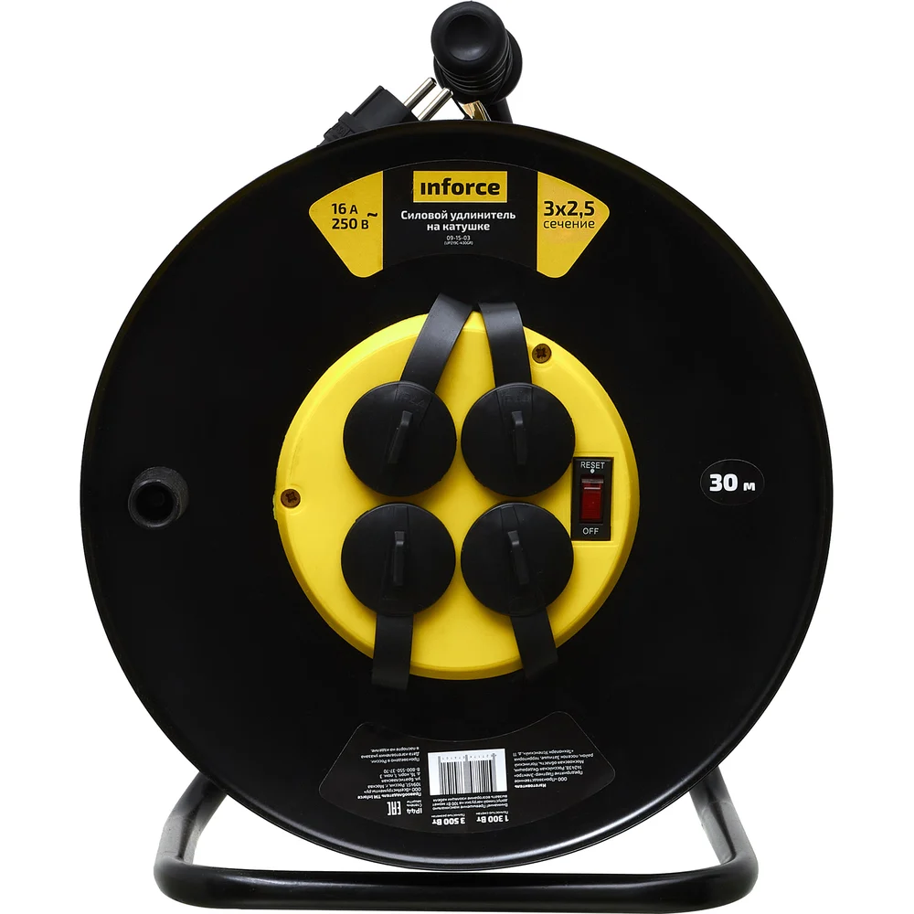 Силовой удлинитель на катушке Inforce 4 гнезда, с/з КГт 3х2,5 16A 30м IP44 GRANITE ZG 09-15-03 предназначен для использования в тяжелых условиях. Удлинитель можно применять на стройках, на производстве, а так же на открытом воздухе. Прочный металлический корпус покрыт специальной порошковой краской. Провод КГ, используемый для удлинителя данного вида, устойчив к механическим повреждениям, так и к повреждениям в результате воздействия низкой температуры воздуха. Удлинители снабжены защитными крышками на розетках, они позволяют защитить контактную группу по стандарту IP44. Безопасность удлинителя обеспечивается за счет наличия термовыключателя, не позволяющего использовать изделие с превышением заявленных характеристик. Внимание! фото товара условное! При выборе ориентируйтесь на технические характеристики.