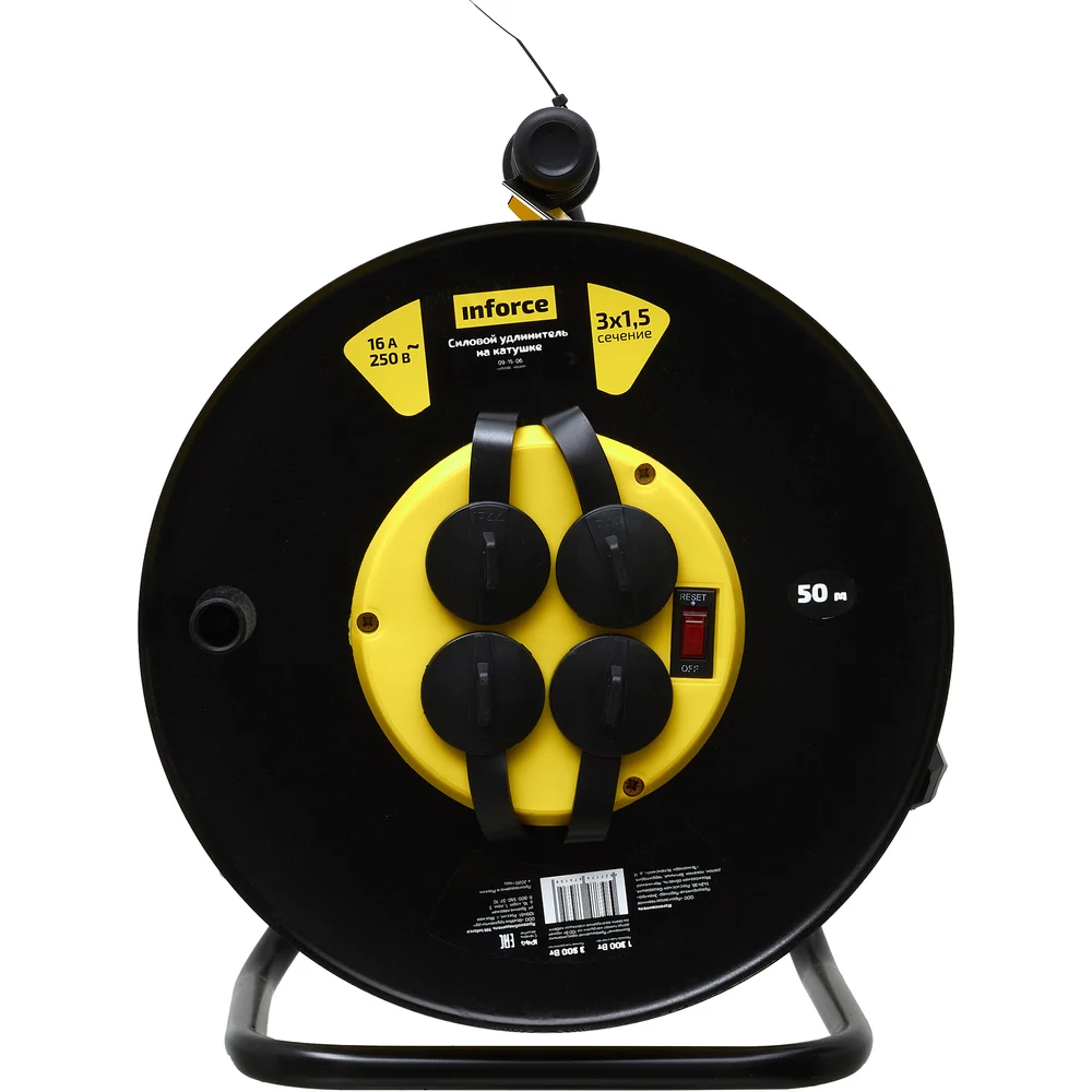 Силовой удлинитель на катушке Inforce 4 гнезда, с/з ПВС 3х1,5 16A 50м IP44 GRANITE ZG 09-15-06 предназначен для использования в тяжелых условиях. Удлинитель можно применять на стройках, на производстве, а так же на открытом воздухе. Кабель изготовлен по ГОСТ 31223-2012. Кабель типа ПВС с сечением 3х1,5 мм² обеспечивает долговечность и устойчивость к механическим повреждениям. Удлинитель имеет степень защиты IP44 и может эксплуатироваться при температуре от -5 до +40°С. Защитные крышки на розетках предохраняют от попадания пыли и влаги, продлевая срок службы удлинителя. Термовыключатель добавляет дополнительный уровень безопасности, предотвращая перегрев. Заземляющий кабель защищает от поражения электрическим током.