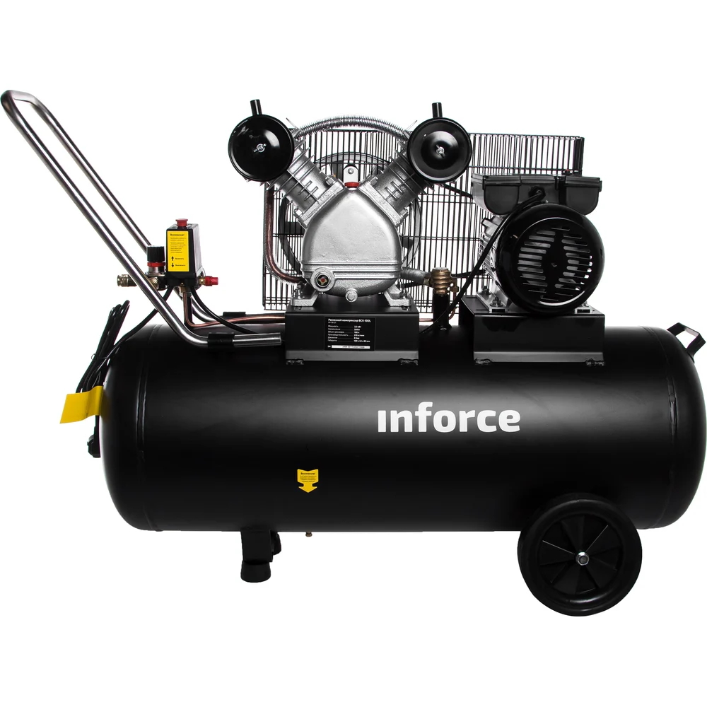 Ременной компрессор Inforce BCX-100L 04-06-31 предназначен для выработки сжатого воздуха в большом объеме. Данная модель работает от сети 220 В. К компрессору можно подключить до 2 пневмоинструментов одновременно. Агрегат отличается надежным исполнением и способен работать длительное время без перерывов. Материалы: Цилиндр: чугун; Поршень: алюминиевый сплав; Голова: алюминиевый сплав; Трубки: медь; Обмотка асинхронного двигателя: алюминий. Компрессор следует хранить в закрытых помещениях при температуре от + 5°C до + 50°C и относительной влажности воздуха 80%.
