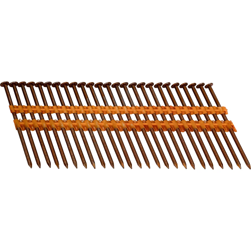Реечный гвоздь по дереву Gigant GGR-70-28RZ используется в строительстве (сборке стропильных систем, деревянных каркасов), упаковочных работах и иных сферах. Рифленый стержень обеспечивает надежное сцепление с материалом, предотвращая выскальзывание. В комплекте 4500 гвоздей на бумажной основе. Расположены под углом 21 градус. Могут использоваться с газовыми или аккумуляторными пистолетами большинства производителей, представленных на рынке (Hybest, Fubag, Зубр, Metabo и др.). Кольцевая накатка обеспечивает повышенное сцепление с древесиной. Бумажная основа и клей подобраны таким образом, что кассеты не разбиваются при падении, а при монтаже бумага полностью отделяется с гвоздем и не застревает в обойме.