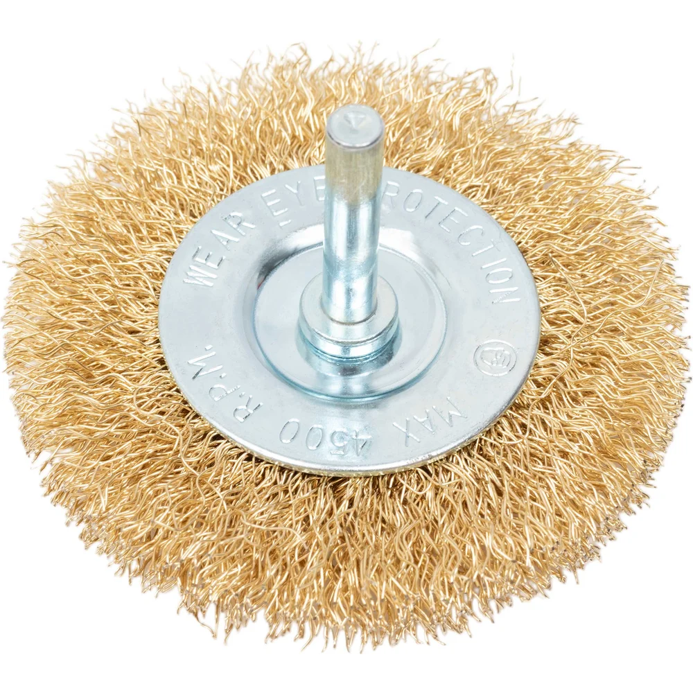 Щетка для дрели, 75 мм, плоская со шпилькой, латунированная витая проволока Gigant G-11043L предназначена для бережной очистки металлических, деревянных, пластиковых поверхностей от загрязнений, старых лакокрасочных материалов и ржавчины. Витая проволока диаметром 0,3 мм проникает в труднодоступные места: пазы, углы, изгибы, узкие участки. Насадку применяют для придания поверхности нужной шероховатости или подчеркивания структуры материала. Хвостовик диаметром 6 мм устанавливается в патрон электродрели, способной работать на рекомендуемой скорости 4500 об/мин. Во время работы следует использовать защитные очки, респиратор, наушники, спецодежду и обувь.