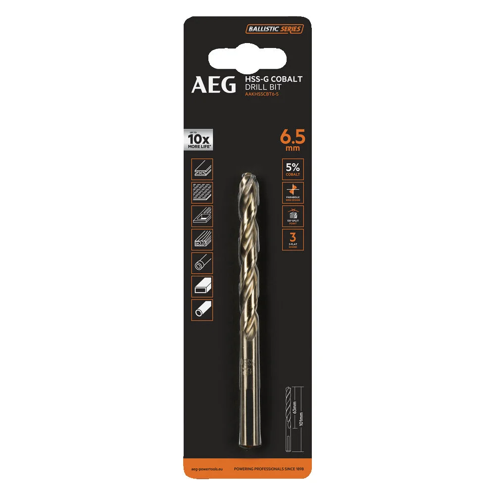 Сверло HSS-Co (6.5х63х101 мм) AEG AAKHSSCBT6-5 4932479335 предназначено для дрелей, шуруповертов и сверлильных станков. Применяется для выполнения глухих/сквозных отверстий в металлических заготовках, древесине, пластике, а также использования в специальных условиях. Оснастка изготовлена из быстрорежущей стали HSS-G c добавлением 5% кобальта, соответствует стандарту DIN 338, что позволяет выполнять сверление как в мягких, так и в твердых материалах. Специальная форма наконечника и заточка под углом 135 градусов обеспечивают точное засверливание и быстрое начало сверления. Точная шлифовка и спиралевидные канавки обеспечивают простое, эффективное удаление стружки и лучшее охлаждение благодаря беспрепятственному доступу смазывающей жидкости к наконечнику сверла. Внимание, изображение товара может отличаться от реального! Верные параметры указаны в технических характеристиках товара.
