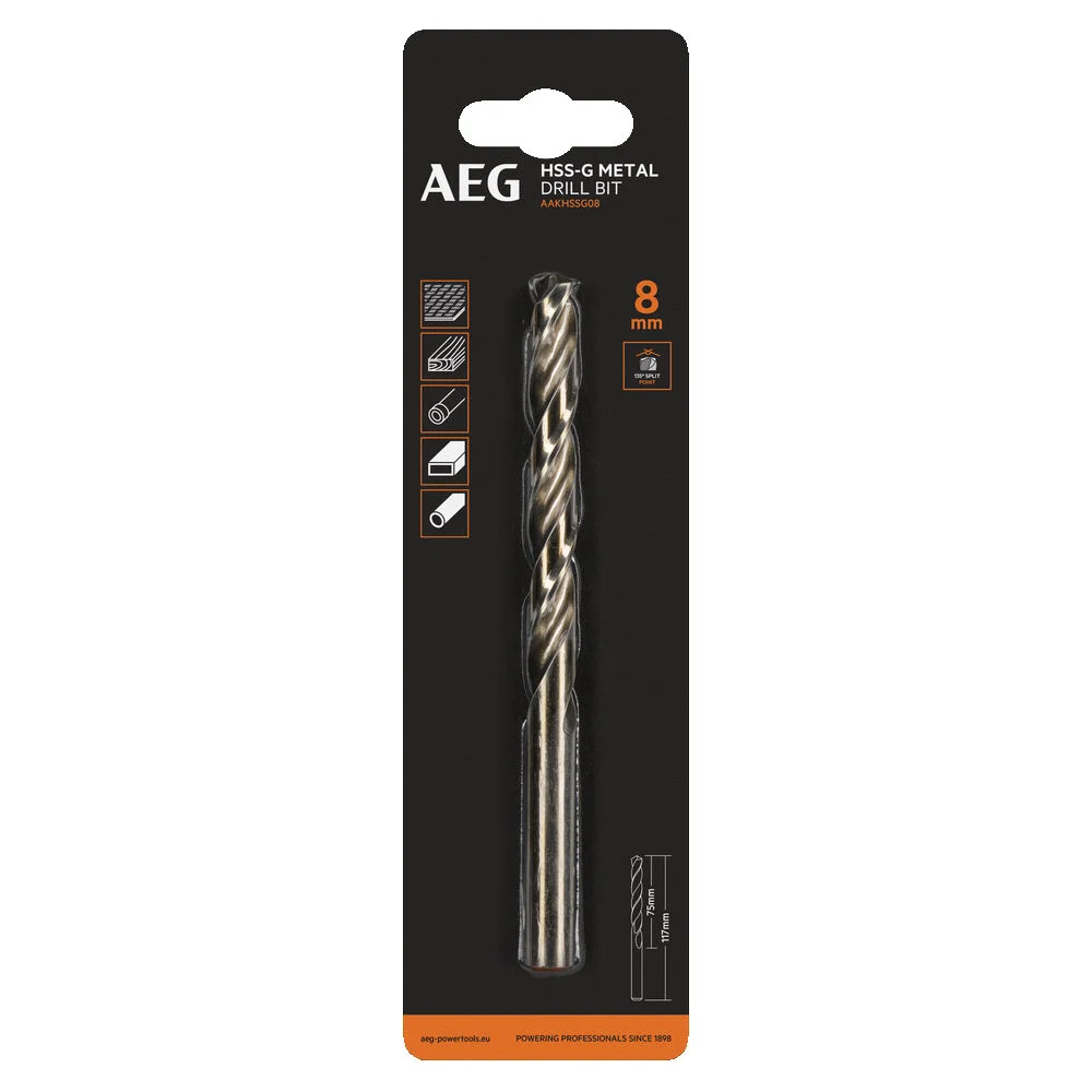 Сверло HSS-G (8х75х117 мм) AEG AAKHSSG08 4932479315 предназначено для дрелей, шуруповертов и сверлильных станков. Применяется для выполнения глухих/сквозных отверстий в металлических заготовках, древесине, пластике. Оснастка изготовлена из быстрорежущей стали HSS-G, соответствует стандарту DIN 338, что позволяет выполнять сверление как в мягких, так и в твердых материалах. Специальная форма наконечника и заточка под углом 135 градусов обеспечивают точное засверливание и быстрое начало сверления. Точная шлифовка и спиралевидные канавки обеспечивают простое, эффективное удаление стружки и лучшее охлаждение благодаря беспрепятственному доступу смазывающей жидкости к наконечнику сверла.