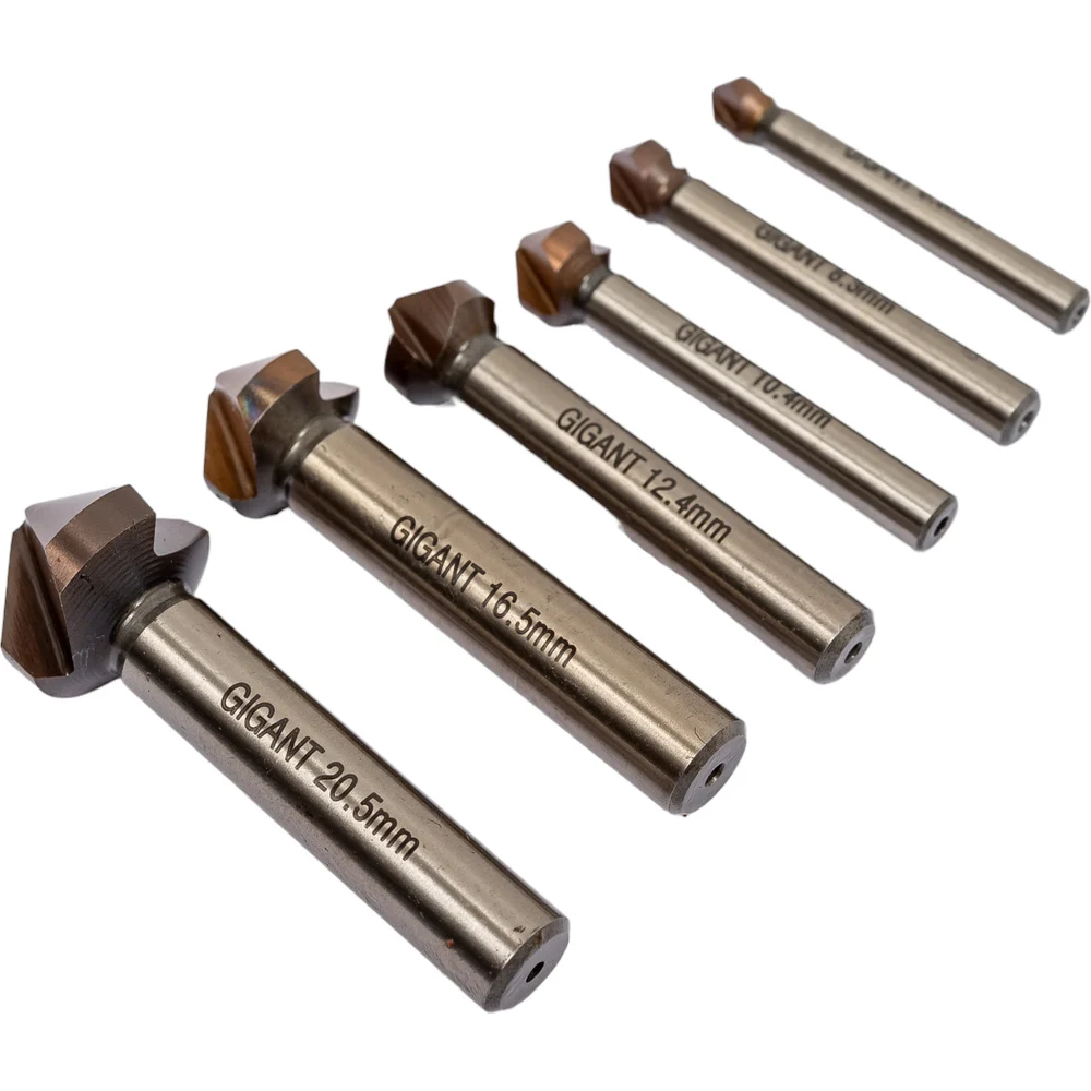 Набор зенкеров (М3-М10) для дрелей Gigant G-29733 имеет три режущие кромки, которые предотвращают изменение геометрии вращения. Выполнен из быстрорежущей стали W6Mo5Cr4V2. Диаметр головки: для резьбы M3 – 6,3 мм; для резьбы M4 – 8,3 мм; для резьбы M5 – 10,4 мм; для резьбы M6 – 12,4 мм; для резьбы M8 – 16,5 мм; для резьбы M10 – 20,5 мм.