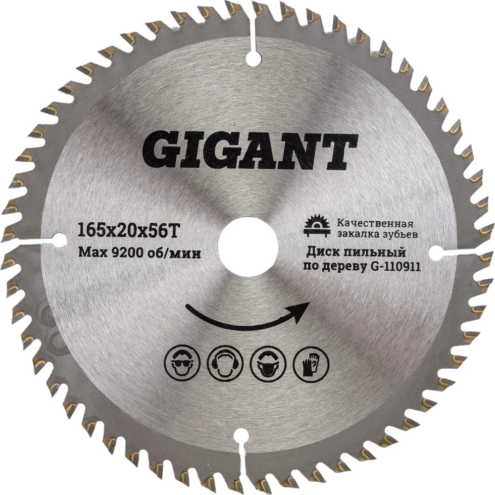 Пильный диск по дереву 165x20x56Т 56 зубьев Gigant G-110911 используется с дисковыми, циркулярными и торцовочными пилами. Профессиональный высокопроизводительный диск для чистого и точного реза мягкой и твердой древесины.