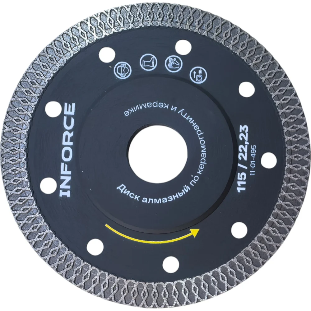 Диск алмазный турбо ультратонкий 115x22.2 мм Inforce 11-01-495 используется для работ по керамограниту и керамике. Х образная режущая кромка позволяет резать без применения воды, не допускает сколов. Технология производства - горячее прессование.