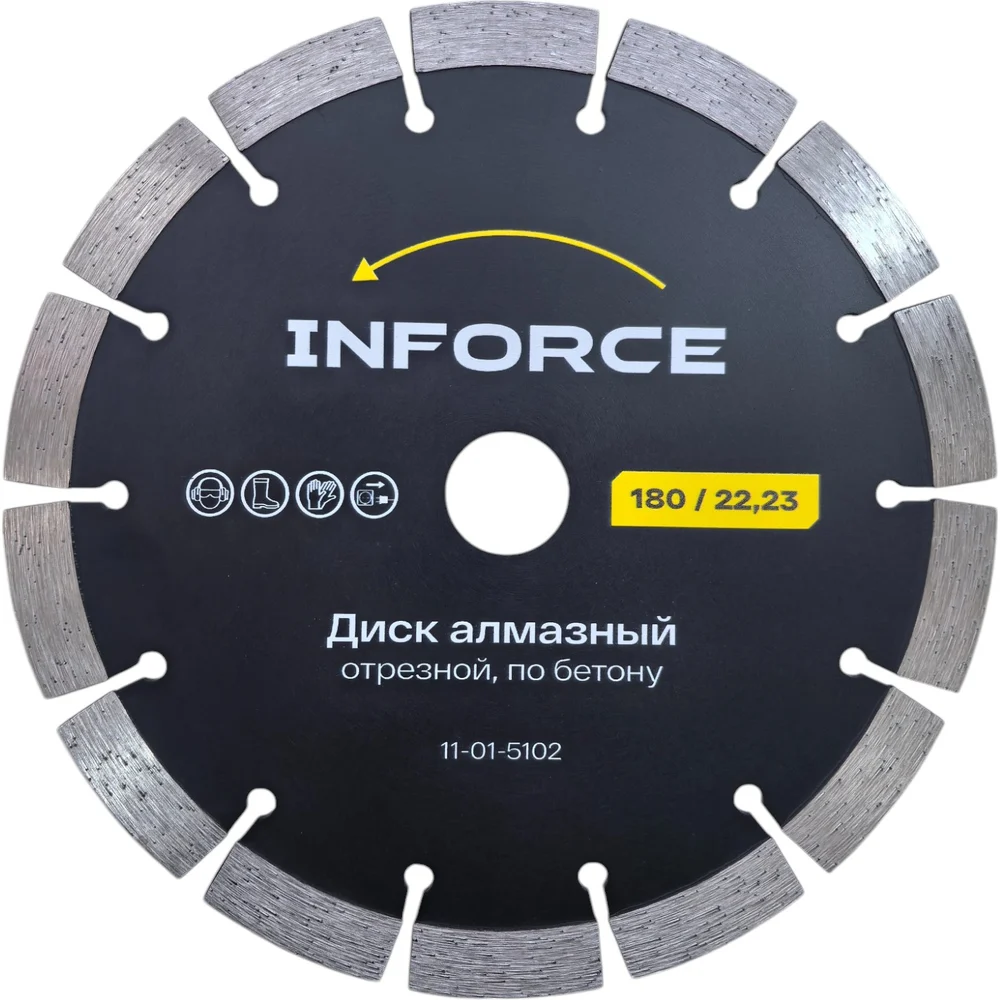 Диск алмазный отрезной по бетону 180x22,23 Inforce 11-01-5102 предназначен для работы с угловыми шлифмашинами ручного применения. Внешний диаметр - 180 мм, внутренний — 22,23 мм, толщина - 3,2 мм.