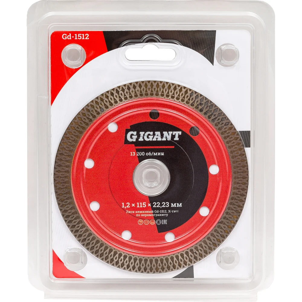 Диск алмазный отрезной Турбо ультратонкий х-тип (1.6x115x22.23 мм) Gigant Gd-1512 - это специализированный диск по керамограниту, керамике. Х образная режущая кромка позволяет резать без применения воды, не допускает сколов. Произведен методом горячего прессования.
