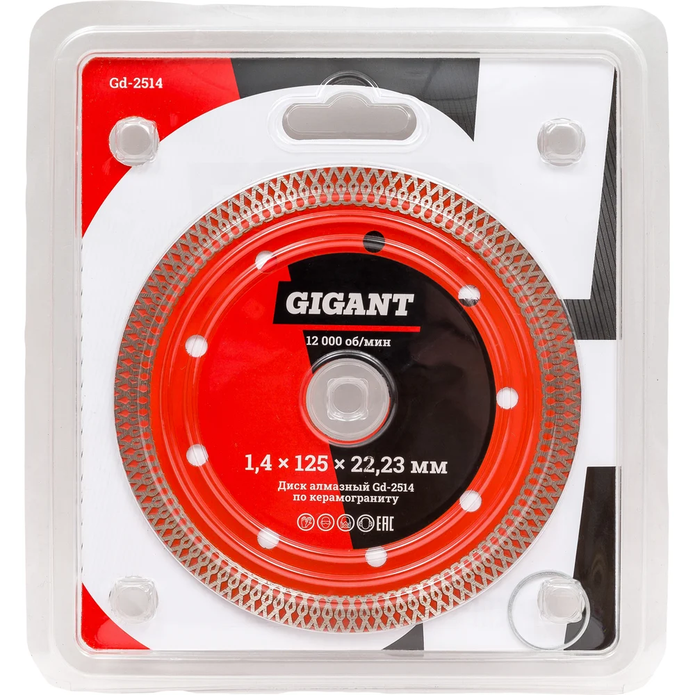 Диск алмазный отрезной Турбо ультратонкий по керамограниту (1.4x125x22.23 мм) Gigant Gd-2514 предназначен для угловых шлифмашин (болгарок). Применяется для резки керамического гранита, твердой и мягкой керамической плитки, а также плит из искусственного и натурального твердого камня. Благодаря возможности использовать воду для охлаждения во время работы уменьшается пылеобразование и увеличивается ресурс диска. Диск имеет высокую концентрацию алмазов мелкой фракции, а также небольшую толщину в 1.4 мм, что обеспечивает высокую скорость реза и повышенную чистоту кромок. Рекомендуются для профессионального применения при наличии большого объема работ.