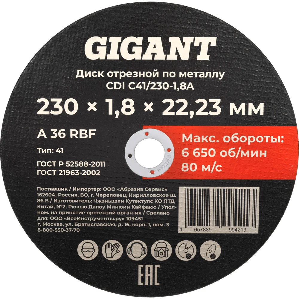 Диск отрезной по металлу 230x1,8x22 Gigant CDI C41/230-1,8A предназначен для угловых шлифовальных машин. Применяется для реза по нержавеющей стали. Диск обладает высокой производительностью и большим ресурсом работы. Оснастка изготавливается на современном оборудовании под строгим контролем качества в соответствии с ГОСТ. Посадочный диаметр — 22,2 мм позволяет использовать диск на большинстве современных шлифовальных машин.