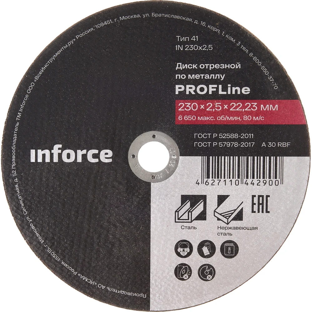 Диск отрезной Inforce IN230x2,5 является сменным элементом для угловых шлифовальных машин. Применяется для резки металлических изделий. Диск обладает высокой производительностью и большим ресурсом работы. Оснастка изготавливается на современном оборудовании под строгим контролем качества. Инструкция по эксплуатации