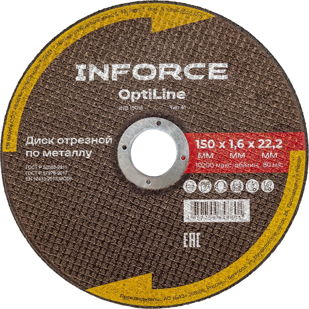 Диск отрезной по металлу OptiLine (150x1.6x22.2 мм) Inforce INB15016 является сменным элементом для угловых шлифовальных машин. Применяется для резки металлических изделий. Диск обладает высокой производительностью и большим ресурсом работы. Оснастка изготавливается на современном оборудовании под строгим контролем качества.