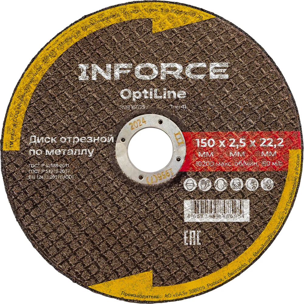Диск отрезной по металлу OptiLine (150x2.5x22.2 мм) Inforce INB15025 является сменным элементом для угловых шлифовальных машин. Применяется для резки металлических изделий. Диск обладает высокой производительностью и большим ресурсом работы. Оснастка изготавливается на современном оборудовании под строгим контролем качества.