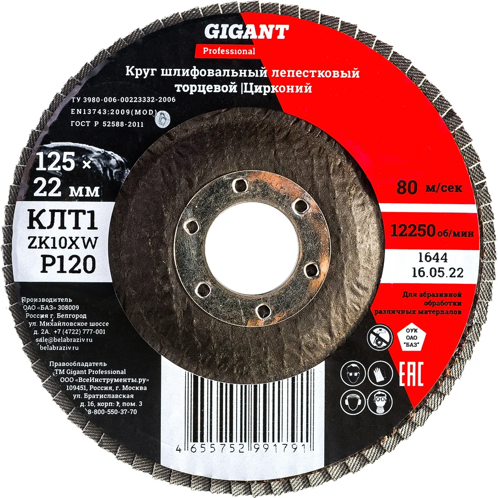 Круг лепестковый Professional 125х22.2 мм, P120, цирконий Gigant GNT-P120 предназначен для угловых шлифовальных машин. Применяется для шлифования, обработки кромок и сварочных швов, деталей и конструкций из различных марок сталей, нержавеющих сталей. Круг работает устойчиво, не оставляет прижогов. Обеспечивает равномерный и качественный процесс шлифовки материала, соответствующий выбранной зернистости круга. Тканевая основа лепестков равномерно изнашивается в процессе работы, открывая следующий слой абразива, позволяя полностью использовать ресурс круга. Gigant – собственная торговая марка компании ВсеИнструменты.ру, разработанная специально для требовательных мастеров. При изготовлении товаров Gigant используется современное оборудование и прочные материалы. Производство осуществляется на современных предприятиях России и Азии. Тестирование товаров осуществляется в два этапа, каждая партия инструментов проходит проверку на соответствие стандартам и заявленным техническим характеристикам. Это является залогом качества и надежности готового продукта. Продукция представлена широкой линейкой инструментов. У нас можно приобрести ручной инструмент, строительный, садовый, сантехнический, климатический, крепежный, автогаражный, а также станки, расходные материалы и многое другое.