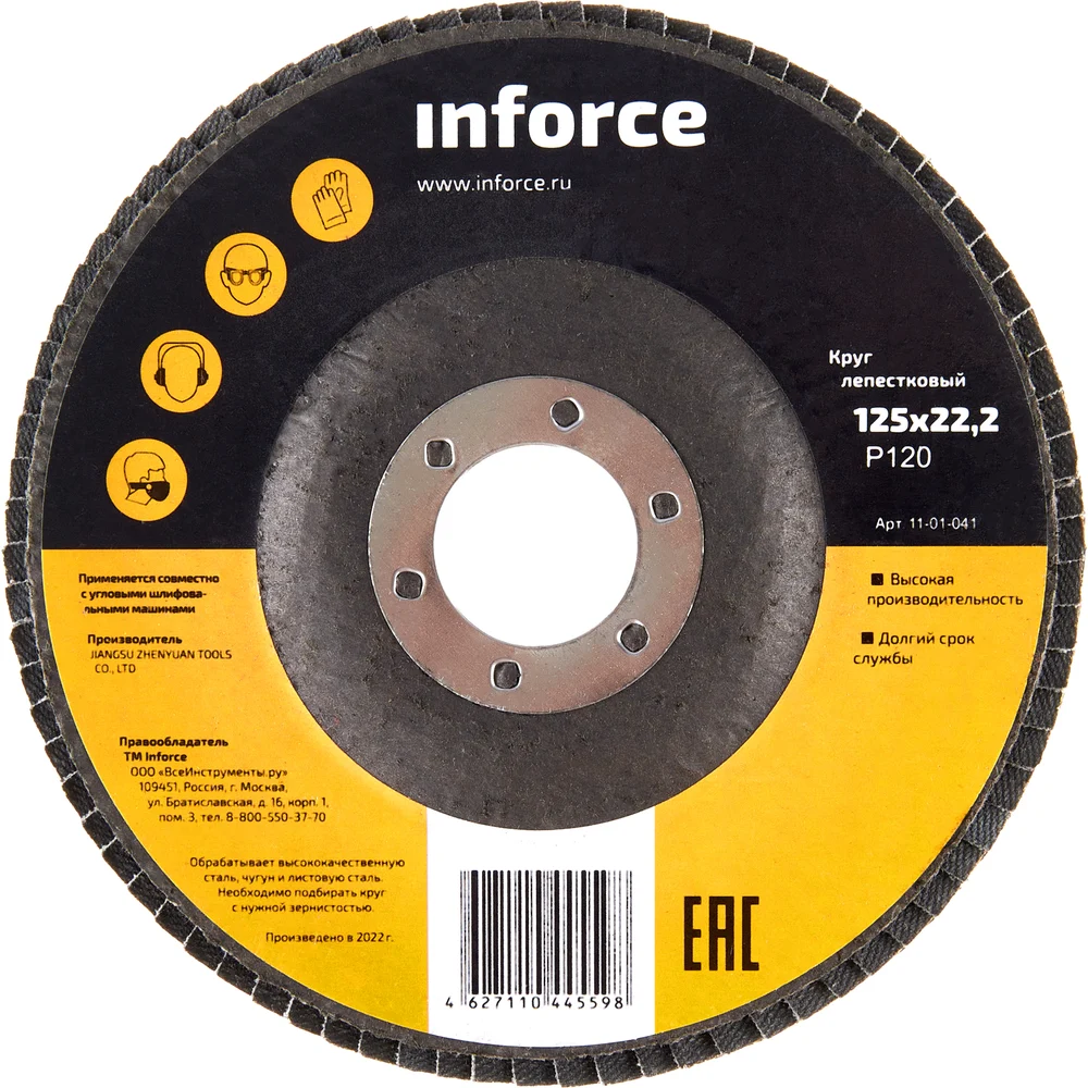 Круг лепестковый Inforce 11-01-041 применяется для обработки высококачественной стали, чугуна, листовой стали с помощью угловой шлифовальной машины. Данная оснастка имеет высокую производительность съема, а также длительный срок службы. Круг идеально подходит для шлифования сварных швов с установочным углом (5-15 градусов). Для качественного результата необходимо подбирать оснастку с нужной зернистостью. Материал зерна – оксид алюминия.