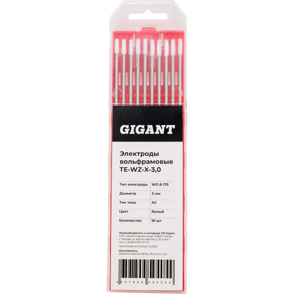 Электроды вольфрамовые WZ-8-175 диам. 3,0 мм белый АС упаковка 10 шт Gigant TE-WZ-X-3,0 предназначены для сварки методом TIG в среде инертных газов. Применяется при сварке алюминия, магния и его сплавов на переменном токе (AC). Электрод содержит 0.8% оксида циркония, благодаря этому облегчается технологический процесс сварки конструкций, поджог дуги. Характеризуется сильной и стабильной сварочной дугой. При сварке не допускается даже минимального загрязнения сварочной ванны. Количество в упаковке - 10 шт.