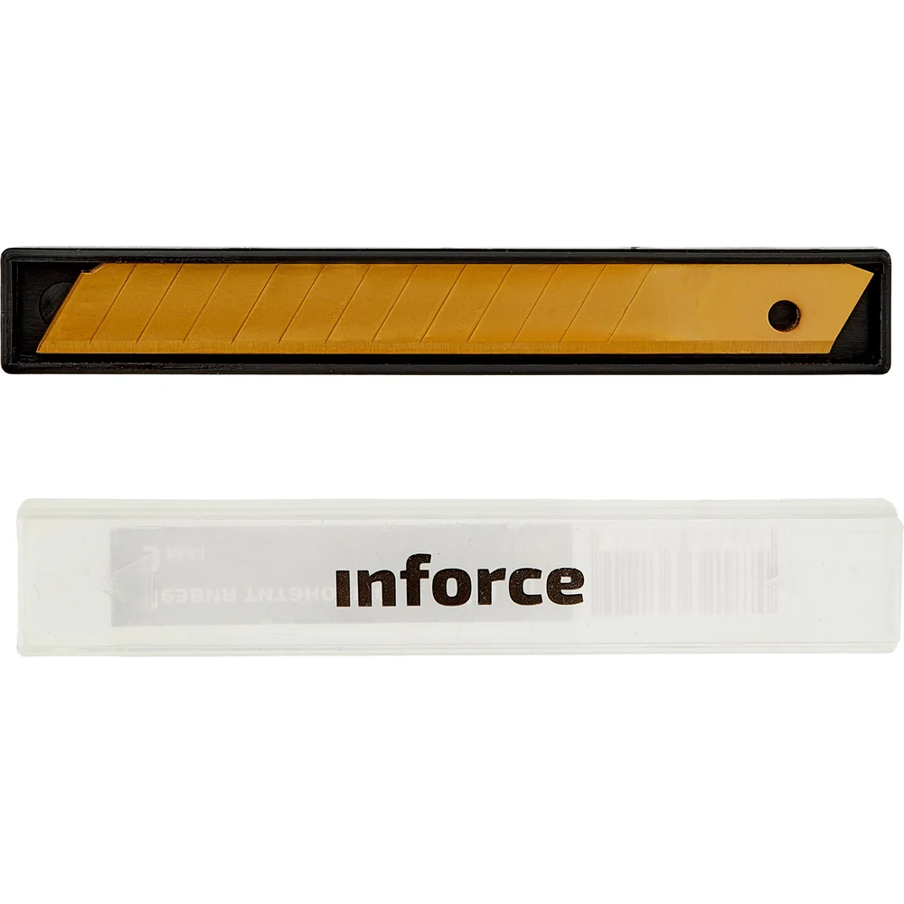 Лезвия сегментированные титановые Inforce 11-03-09 предназначены для технических и строительных ножей. Применяются для реза картона, линолеума, древесины и других материалов. Лезвия имеют нитридтитановое покрытие, что обеспечивает высокую прочность, увеличенный срок службы. Кроме того, лезвия не подвергаются коррозии. Сегментированная система лезвий очень удобна и существенно экономит время на заточку оснастки – при затупливании лезвия необходимо просто отломить старый сегмент и можно работать дальше.