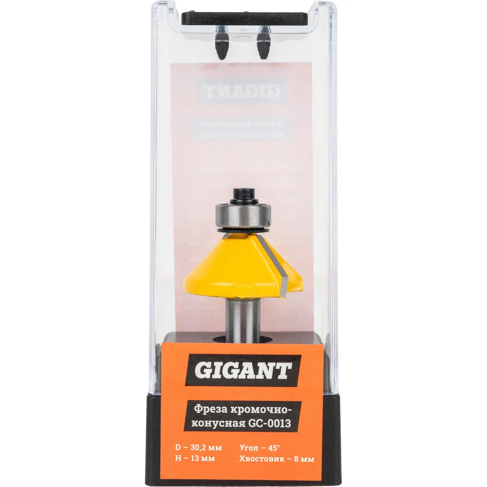 Фреза кромочно конусная D30.2 H13мм ∠45 хвостовик 8мм Gigant GC-0013 предназначена для выполнения фаски на кромках столярных изделий и декоративной обработки кромок столешниц, элементов корпусной мебели. Выполнение угловой фаски по ребру делянок и последующее склеивание по длине, дает возможность получать объемные столярные изделия. Используется совместно с фрезерными машинами и фрезерными станками. Фреза изготавливается из высококачественных материалов и характеризуется точно рассчитанной геометрией режущей кромки, обработанной алмазными дисками до точности биения 0.02 мм. Структура твердого сплава гарантирует его высокую стойкость к выщерблению по режущей кромке и, следовательно, качество обработки изделия.