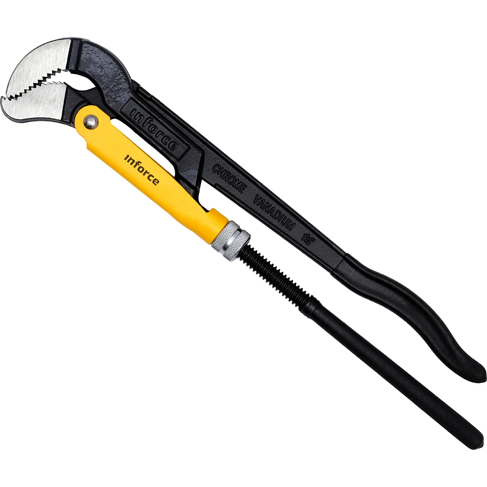 Трубный рычажный ключ Inforce №2 тип S 06-05-115 - цельнокованый инструмент, выполненный из хромованадиевой стали и обработанный порошковым покрытием для увеличения долговечности. Регулируемая гайка для настройки зажима оснащена стопорным кольцом. Зажимные губки имеют зубья, у которых наклон направлен против вращения, что способствует более надежному хвату.