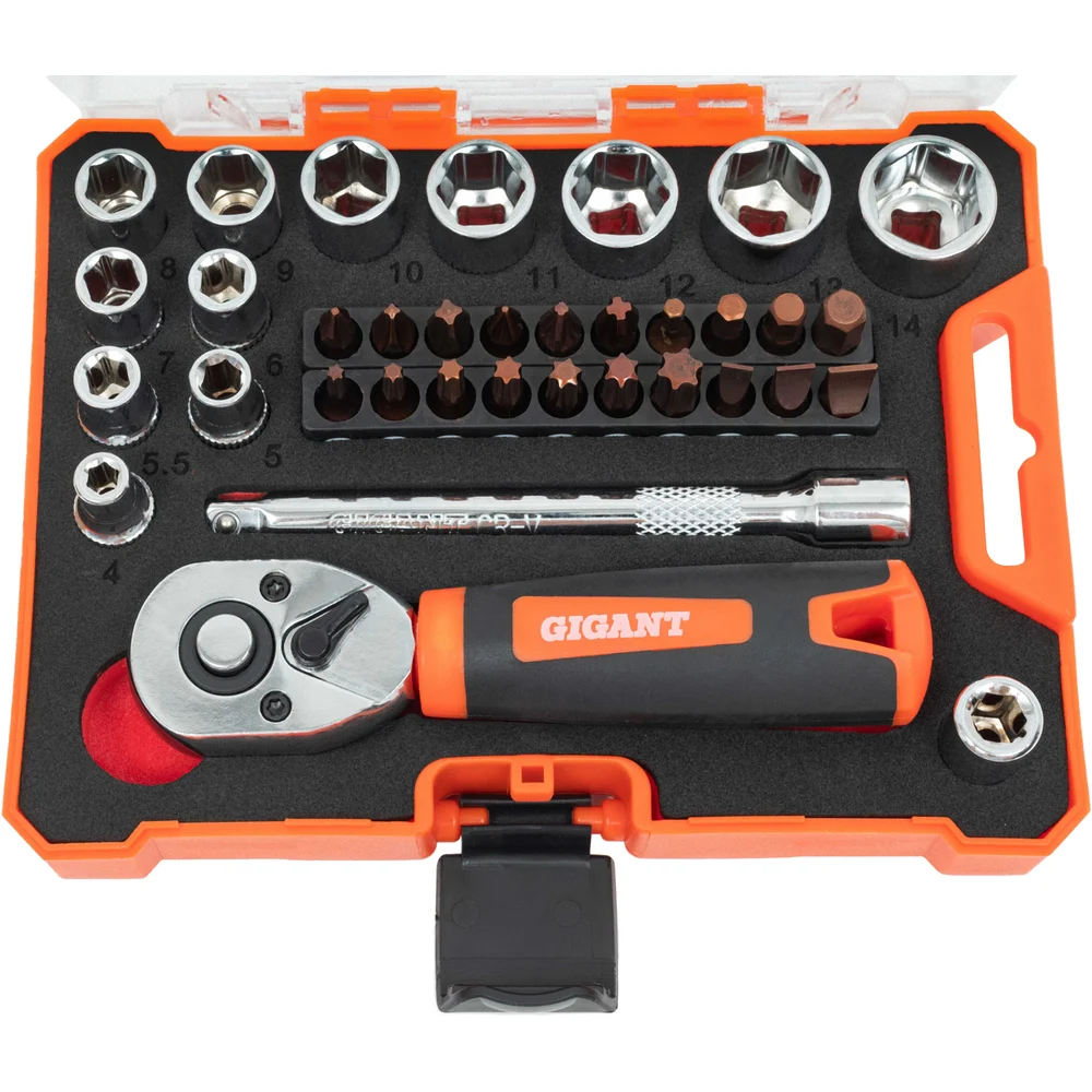 Набор Gigant GSBR-1/4 представляет собой универсальное решение для выполнения разнообразных задач благодаря своему широкому ассортименту компонентов. В комплект входят 20 бит различных типов, включая SL, PH, PZ, T(TX), HEX и SQ, что позволяет работать с различными крепежными элементами. Торцовые головки размером от 4 мм до 13 мм и шестигранный тип головок обеспечивают надежное сцепление и точность в работе. Трещотка с посадочным размером 1/4 дюйма и удлинитель 75 мм позволяют работать в труднодоступных местах. Все элементы набора упакованы в удобный кейс, что облегчает хранение и транспортировку.