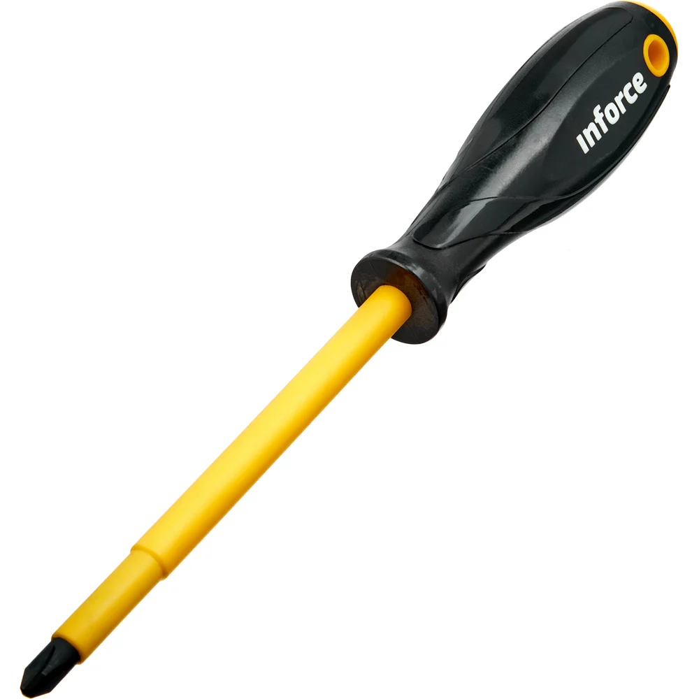 Диэлектрическая отвертка PH3х150мм Inforce 06-09-76 оборудована прочным и надежным стальным стержнем для сложных работ с крепежом. Рельефная рукоять прочно соединена со стержнем, что позволяет работать с большим усилием. Диэлектрическое покрытие делает безопасной работу в бытовых электросетях.