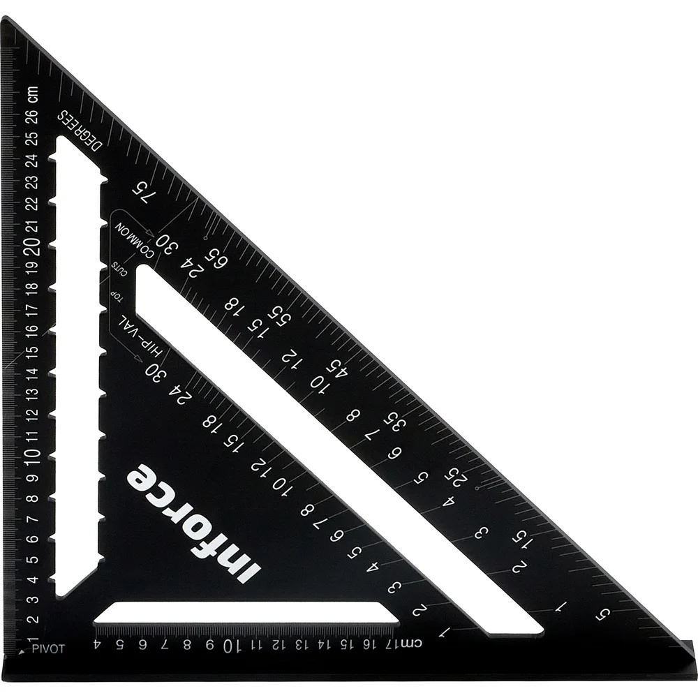 Кровельный угольник Inforce 305 мм 06-11-75 используется при строительстве кровли и крыши, разметки коньков и стропил. Удобен для откладывания прямых линий, параллельных или перпендикулярных основным направлениям детали. Прочный профиль препятствует изгибанию инструмента, что позволяет сохранить высокую точность измерений. Дополнительные прорези позволяют откладывать сложные ломаные линии.