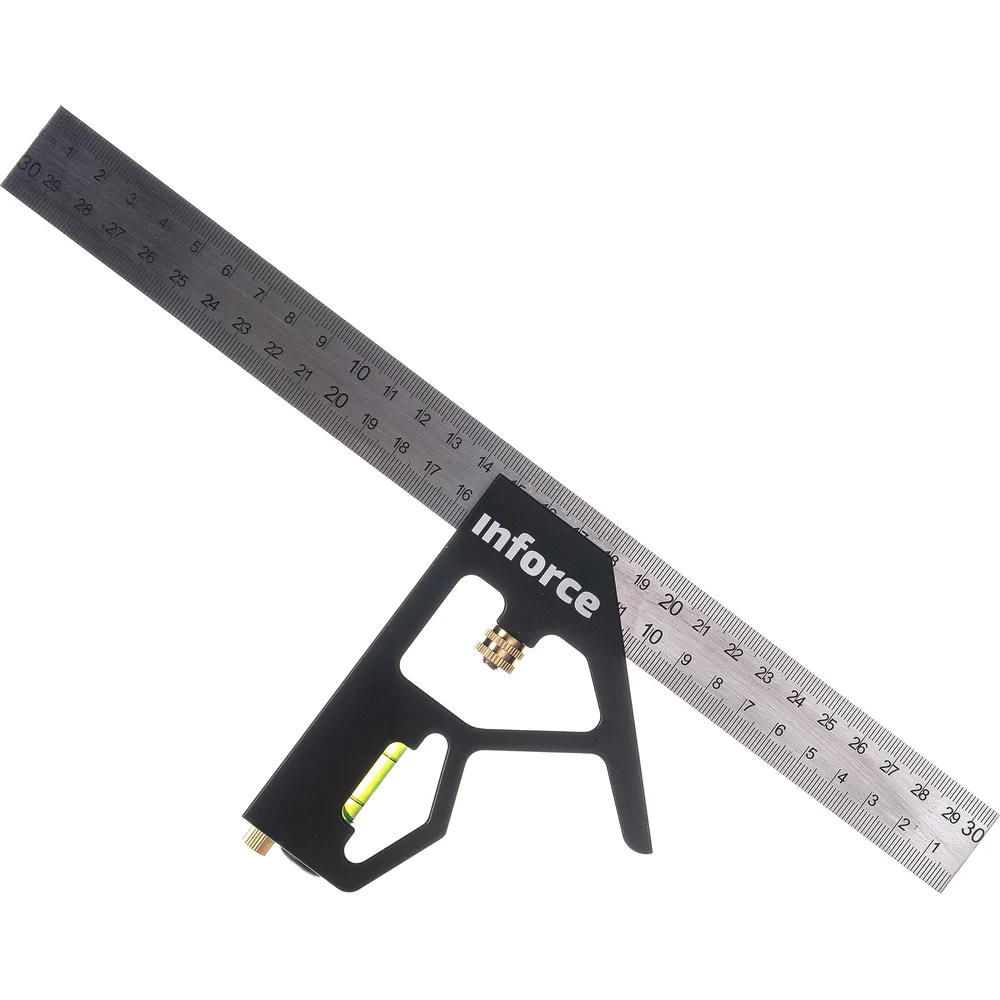 Угольник с уровнем 300 мм Inforce 06-11-67 удобен для откладывания прямых линий, параллельных или перпендикулярных основным направлениям детали. Прочная сталь препятствует изгибанию инструмента, что позволяет сохранить высокую точность измерений. Уровень дополнительно увеличивает качество работы. Внимание! Угольник имеет только сантиметровую разметку, дюймовой разметки нет.