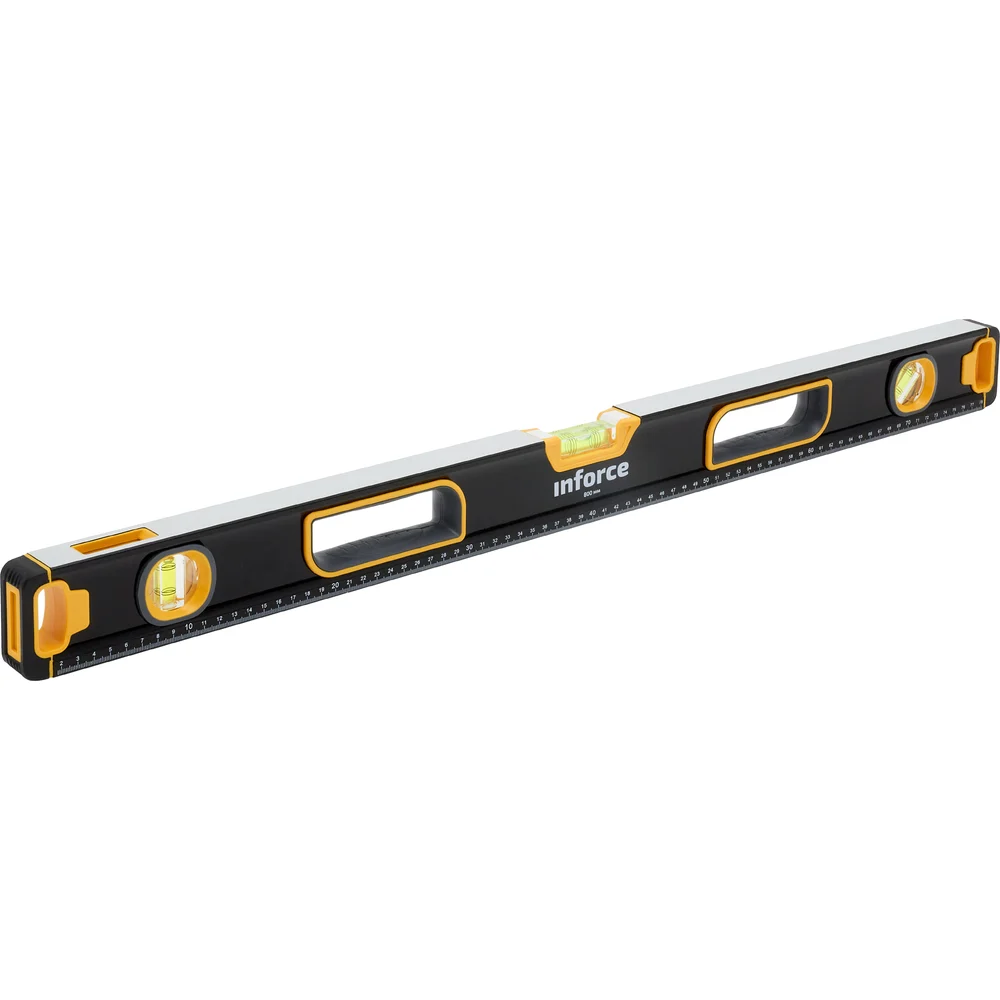Строительный уровень 800мм Inforce 06-11-57 позволяет с высокой точностью определить отклонения от горизонтали и вертикали. На корпус нанесена разметка для проведения измерений длины. Заглушки на концах уровня защищают от повреждений в случае случайного падения.