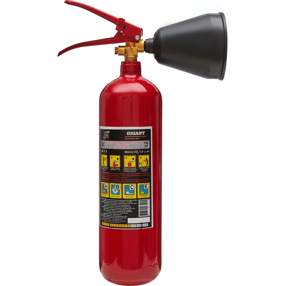 Углекислотный огнетушитель Gigant ОУ-1-ВСЕ-01 GT-ОУ-1 - это закачной огнетушитель высокого давления с зарядом жидкой двуокиси углерода, находящейся под давлением жидких паров. Применяется для первичного тушения пожаров и возгораний класса B, C, E (горючие и легковоспламеняющиеся жидкости, горючие газы, электроустановки, не превышающие напряжение 10000 Вольт). Углекислотный огнетушитель предназначен для быстрого охлаждения поверхности и рассеивания газа. Благодаря действию диоксида углерода материальные ценности практически не разрушаются, на них не остается разводов и пятен. Возгорание прекращается за счет охлаждения области горения. Огнетушитель особенно эффективен для локализации пожара на начальной стадии и тех видов возгорания, где запрещено применение воды. Подходит для оснащения: помещений с компьютерной техникой и оргтехникой, серверных комнат; транспорта (автомобили, городской транспорт); электроустановок, находящихся под напряжением до 10000 В и щитов управления; музеев, выставок, картинных галерей и пр. Внимание, изображение товара может отличаться от реального! Верные параметры указаны в технических характеристиках товара.