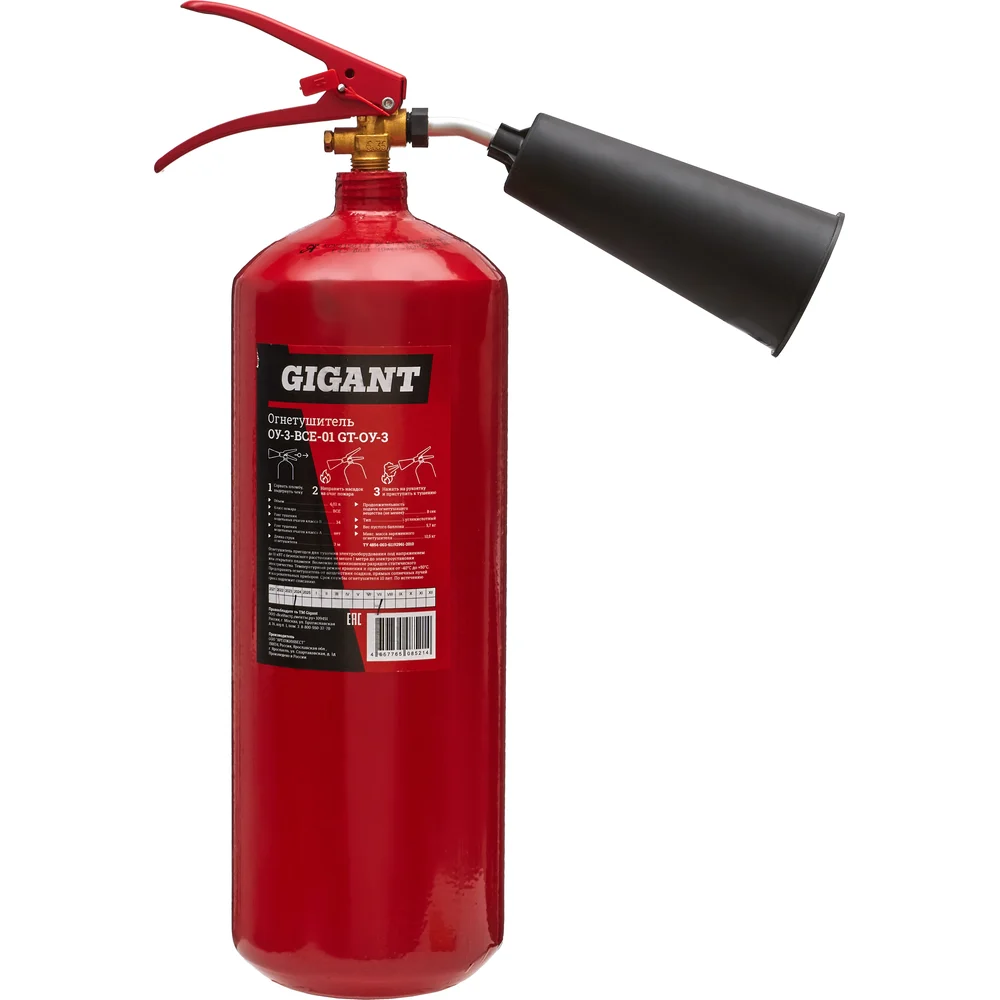 Углекислотный огнетушитель Gigant ОУ-3-ВСЕ-01 GT-ОУ-3 - это закачной огнетушитель высокого давления с зарядом жидкой двуокиси углерода, находящейся под давлением жидких паров. Применяется для первичного тушения пожаров и возгораний класса B, C, E (горючие и легковоспламеняющиеся жидкости, горючие газы, электроустановки, не превышающие напряжение 10000 Вольт). Основным преимуществом углекислотного огнетушителя является то, что двуокись углерода не повреждает объект тушения и не оставляет следов.