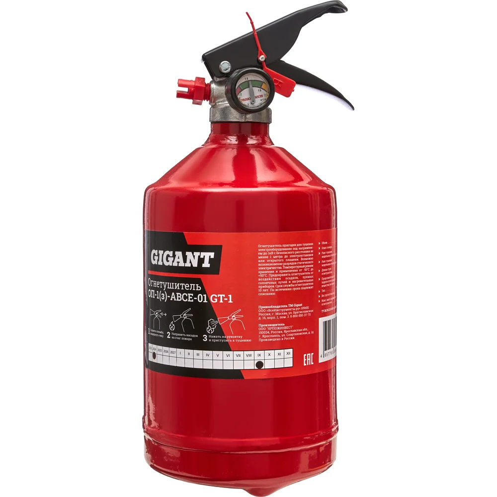 Огнетушитель Gigant ОП-1(з)-АВСЕ-01 GT-1 предназначен для первичного тушения пожаров и возгораний класса A, B, C, E (горючие и легковоспламеняющиеся жидкости, твердые горючие вещества и газы, электроустановки, не превышающие напряжение 1000 Вольт). Изделие подходит для оснащения различных объектов и помещений: административных зданий, жилых домов, офисов, гостиниц, промышленных участков и мн. др.