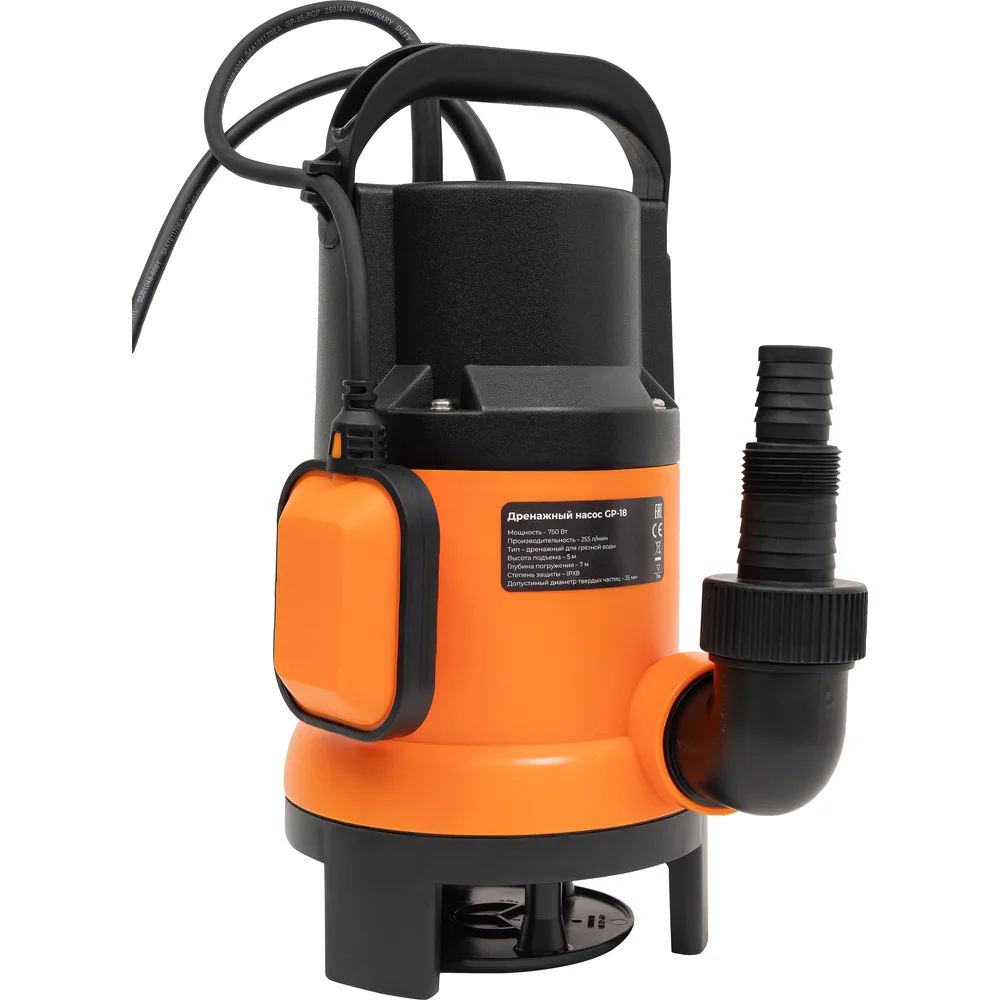 Дренажный насос для грязной воды Gigant GP-18 используется для перекачки загрязненной воды из естественных водоемов, оросительных каналов и дренажных колодцев, затопленных жилых помещений и подвалов. Допустимый размер пропускаемых механических частиц - до 35 мм. Использование в воде с более крупными включениями изнашивает рабочие части насоса и может привести к заклиниванию рабочего колеса. Дренажный насос оснащен поплавковым выключателем для предотвращения работы «всухую». Длина кабеля поплавка настраивается в зависимости от дебета водоема, чтобы двигатель отключался при достижении минимального или максимального уровня воды. В модели нижний забор воды, это необходимо учесть при установке уровня выключения насоса. Количество срабатываний не должно превышать 20 в час. Корпус насоса выполнен из пластика, сверху имеется удобная ручка для транспортировки и крепления троса. Насос способен создавать напор в 5 м и перекачивать до 255 л/мин. Выходная магистраль имеет диаметр 1,5 дюйма.